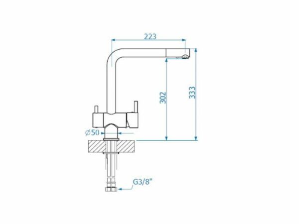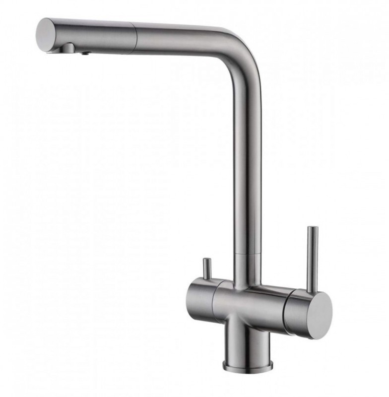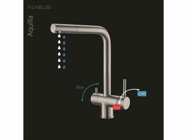 Bateria Alveus Aquila, prevazuta cu trei cai (apa calda, apa rece si apa filtrata), are un finisaj din material compozit sau inox. Este o baterie cu comanda dubla, cu cartus ceramic, pipa inalta si rotativa. Are cartus ceramic si sistem de montaj rapid Easy Fix.