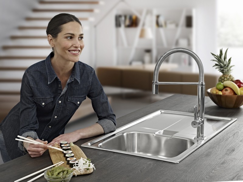 Baterie de bucatarie prevazuta cu teava de curgere flexibila rezistenta; Aerator anticalcar; Maner extractibil cu functie de jet aerat