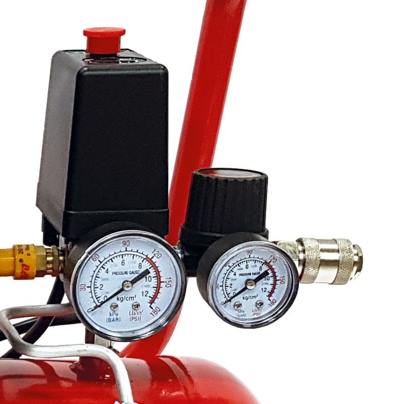 Este echipat cu presostat, protectie termica cu resetare automata, regulator de presiune, manometru, supapa de siguranta, robinet de purjare a condensului, maner pentru transport.