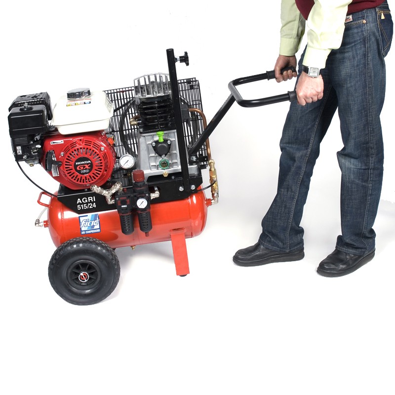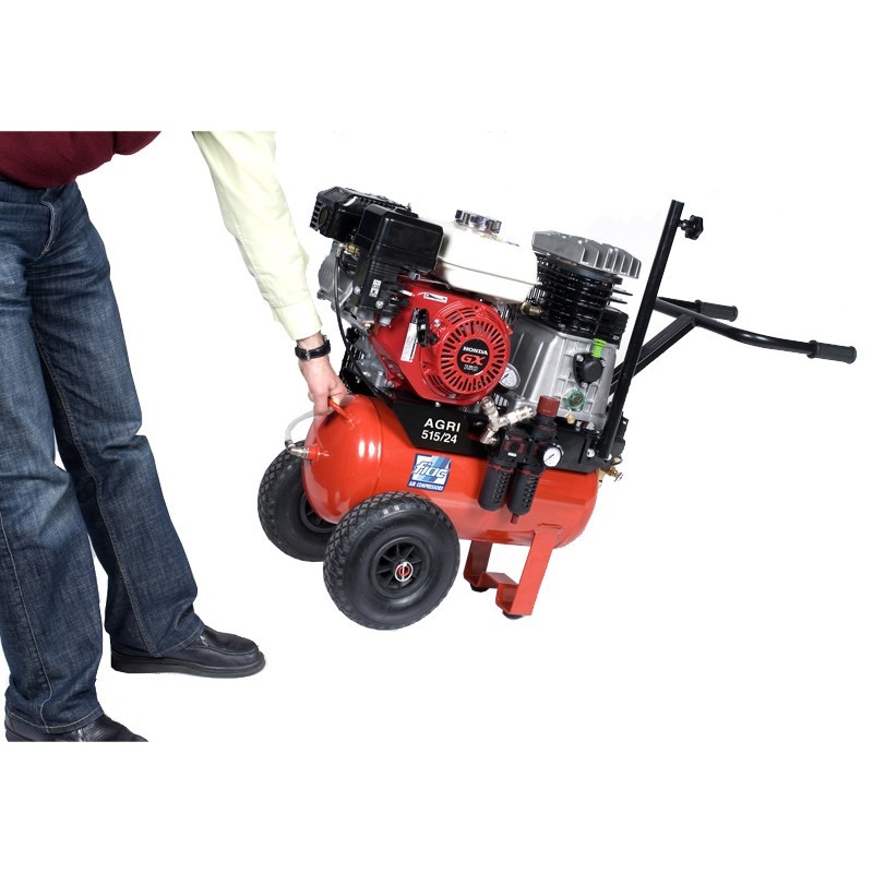 AGRI este un compresor profesional cu doua pistoane actionat prin curea de un motor termic HONDA in 4 timpi, de 5,5 CP, benzina. Are un randament imbunatatit, o constructie robusta si este echipat cu presostat cu protectie termica resetabila manual, manometru, reductor de presiune, supapa de siguranta, robinet de purjare, maner si roti de transport.