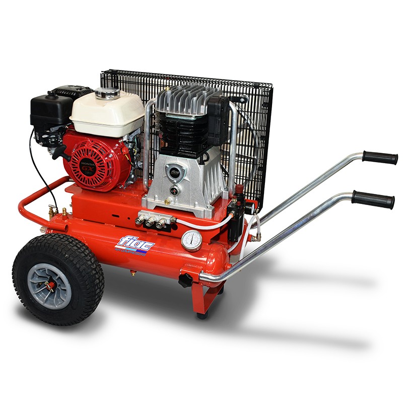 AGRI 65 este un compresor profesional cu doua pistoane actionat prin curea de un motor termic HONDA in 4 timpi, de 9 CP, benzina. Are un randament imbunatatit, o constructie robusta si este echipat cu presostat cu protectie termica resetabila manual, manometru, reductor de presiune, supapa de siguranta, robinet de purjare, maner si roti de transport.