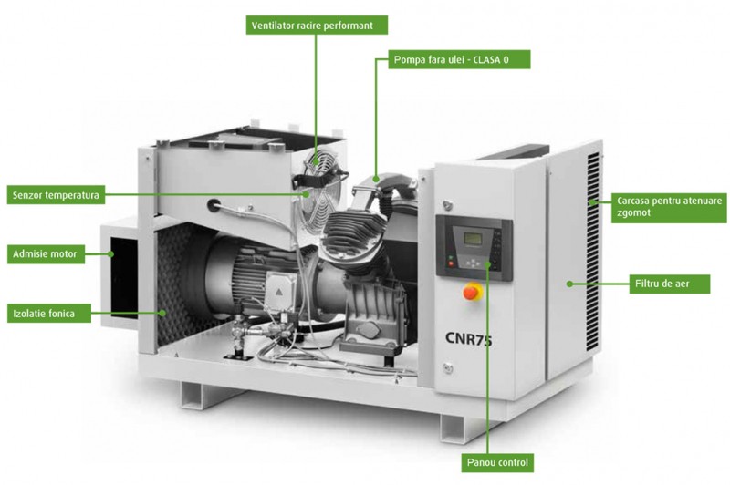Proiectate cu componente premium si pentru utilizare intensa, compresoarele CleanAIR CNR 75 ofera aer 100% pur, fara ulei pentru o gama larga de aplicatii industriale.