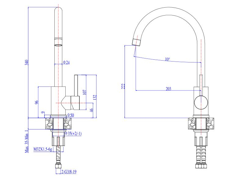 Dimensiunile acesteia sunt: 20.3 cm latime si 34 cm inaltime. Aceasta baterie Alveus poate fi montata pe chiuveta sau pe blatul de bucatarie si vine insotita de sistem prindere si racorduri flexibile.