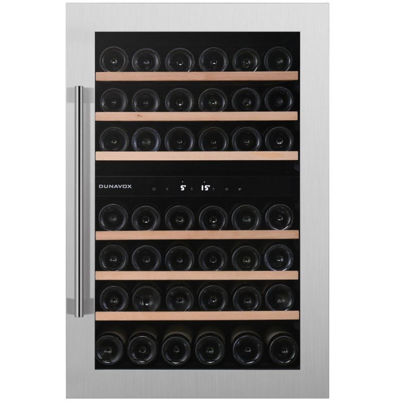 Unitate cu două zone de temperatură și sistem de răcire cu compresor din gama Dunavox SOUL. Cu un aspect elegant și manerul și rama ușii din inox, se potrivește perfect intr-o bucătărie modernă. Iluminarea interioară LED de culoare albă, portocalie sau albastră dă un plus de strălucire acestei unități. Capacitatea maximă este de 42 sticle de 0,75l format Bordeaux stocate pe rafturi din lemn de fag. Acest aparat este destinat a fi incorporat in mobilier și nu poate fi folosit de sine stătător.
